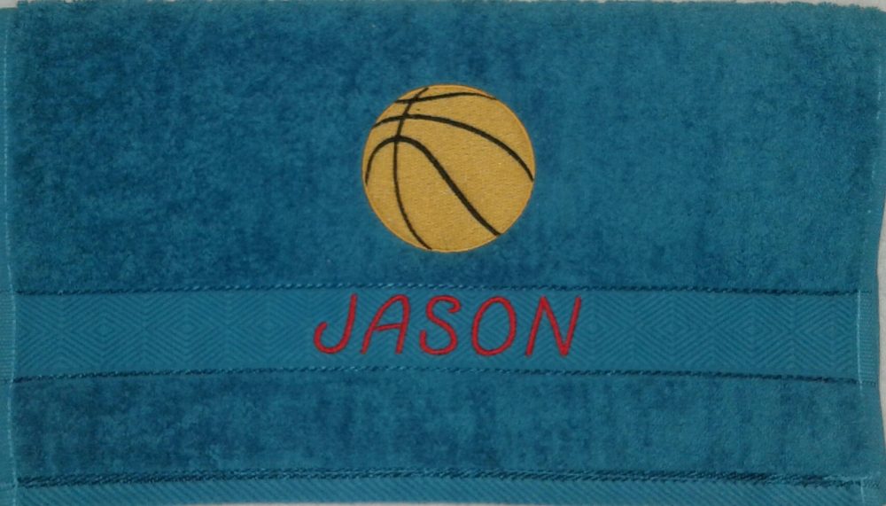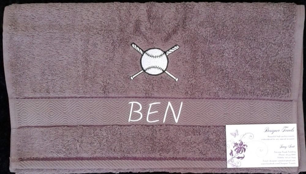 • Price is for a name embroidered on the band of the towel and a small sports design above the band